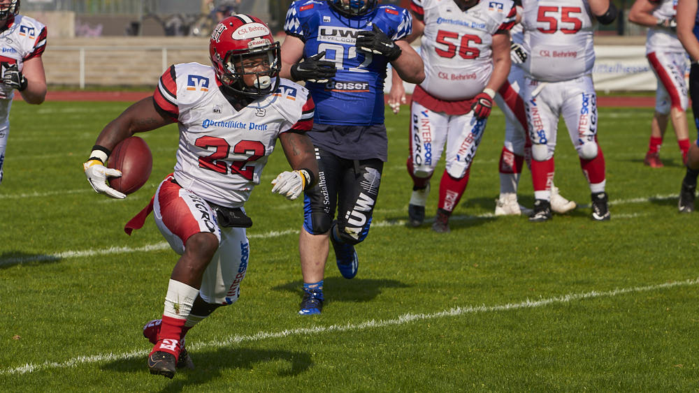 Aber auch die Verteidigung trumpfte auf. Besonders die Rushing Defense, die beim ersten Aufeinandertreffen von dem für gewöhnlich exzellenten Comets-Laufspiel geknechtet wurde, zeigte sich bärenstark. Die Hausherren ließen nur 18 Yards zu. „Wir haben zwar durch die Luft mehr als 200 Yards zugelassen, aber das nehme ich freudig an, wenn wir den Lauf fast komplett eliminiert haben“, sagte Sergej Schmidt, Defensive Coordinator der Marburger. In den ersten 45 Spielminuten hielten seine Schützlinge den Gegner bei drei Punkten.